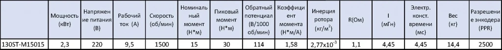 - STEP/DIR (синонимы STEP/SIGN, PULSE/DIR, PULSE/SIGN) - управление по 2 сигналам, логический 0/1 направление и меандр тактирования. Два оптоизолированных входа с сопротивлением 270 Ом для использования 5 В логики, при использовании напряжения выше 5В(12/24) в комплекте поставляется резистор на 2 кОм.Сервокомплект поставляется с PMSM приводом 130ST-M15015 в базовом оснащении с инкрементным энкодером TAMAGAWA на 2500 строк, все параметры привода приведены в таблице ниже.