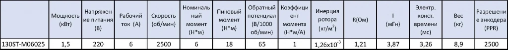 - STEP/DIR (синонимы STEP/SIGN, PULSE/DIR, PULSE/SIGN) - управление по 2 сигналам, логический 0/1 направление и меандр тактирования. Два оптоизолированных входа с сопротивлением 270 Ом для использования 5 В логики, при использовании напряжения выше 5В(12/24) в комплекте поставляется резистор на 2 кОм.Комплект поставляется с приводом 130ST-M06025 в базовом оснащении с инкрементным энкодером TAMAGAWA на 2500 строк, все параметры сервопривода приведены в таблице ниже.