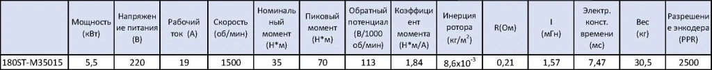 - STEP/DIR (синонимы STEP/SIGN, PULSE/DIR, PULSE/SIGN) - управление по 2 сигналам, логический 0/1 направление и меандр тактирования. Два оптоизолированных входа с сопротивлением 270 Ом для использования 5 В логики, при использовании напряжения выше 5В(12/24) в комплекте поставляется резистор на 2 кОм.Сервокомплект поставляется с PMSM приводом 180ST-M35015 в базовом оснащении с инкрементным энкодером TAMAGAWA на 2500 строк, все характеристики серводвигателя приведены в таблице ниже.