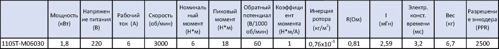 - STEP/DIR (синонимы STEP/SIGN, PULSE/DIR, PULSE/SIGN) - управление по 2 сигналам, логический 0/1 направление и меандр тактирования. Два оптоизолированных входа с сопротивлением 270 Ом для использования 5 В логики, при использовании напряжения выше 5В(12/24) в комплекте поставляется резистор на 2 кОм.Комплект поставляется с сервомотором 110ST-M06030 в базовом оснащении с инкрементным энкодером TAMAGAWA на 2500 строк, все параметры привода приведены в таблице ниже.