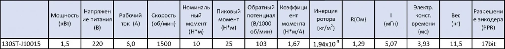 - STEP/DIR (синонимы STEP/SIGN, PULSE/DIR, PULSE/SIGN) - управление по 2 сигналам, логический 0/1 направление и меандр тактирования. Два оптоизолированных входа с сопротивлением 270 Ом для использования 5 В логики, при использовании напряжения выше 5В(12/24) в комплекте поставляется резистор на 2 кОм.Сервокомплект поставляется с сервомотором 130ST-J10015 в базовом оснащении с абсолютным энкодером TAMAGAWA 17 bit, все характеристики привода приведены в таблице ниже.