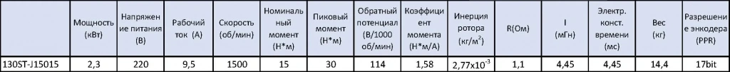 - STEP/DIR (синонимы STEP/SIGN, PULSE/DIR, PULSE/SIGN) - управление по 2 сигналам, логический 0/1 направление и меандр тактирования. Два оптоизолированных входа с сопротивлением 270 Ом для использования 5 В логики, при использовании напряжения выше 5В(12/24) в комплекте поставляется резистор на 2 кОм.Комплект поставляется с PMSM приводом 130ST-J15015 в базовом оснащении с абсолютным энкодером TAMAGAWA 17 bit, все параметры привода приведены в таблице ниже.