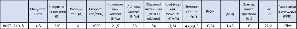 - STEP/DIR (синонимы STEP/SIGN, PULSE/DIR, PULSE/SIGN) - управление по 2 сигналам, логический 0/1 направление и меандр тактирования. Два оптоизолированных входа с сопротивлением 270 Ом для использования 5 В логики, при использовании напряжения выше 5В(12/24) в комплекте поставляется резистор на 2 кОм.Комплект поставляется с сервоприводом 180ST-J21015 в базовом оснащении с абсолютным энкодером TAMAGAWA 17 bit, все характеристики серводвигателя приведены в таблице ниже.