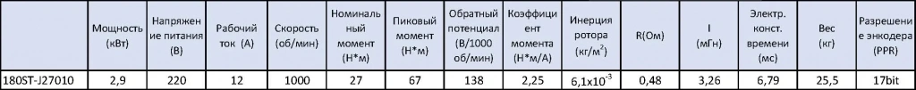 - STEP/DIR (синонимы STEP/SIGN, PULSE/DIR, PULSE/SIGN) - управление по 2 сигналам, логический 0/1 направление и меандр тактирования. Два оптоизолированных входа с сопротивлением 270 Ом для использования 5 В логики, при использовании напряжения выше 5В(12/24) в комплекте поставляется резистор на 2 кОм.Комплект поставляется с приводом 180ST-J27010 в базовом оснащении с абсолютным энкодером TAMAGAWA 17 bit, все характеристики серводвигателя приведены в таблице ниже.
