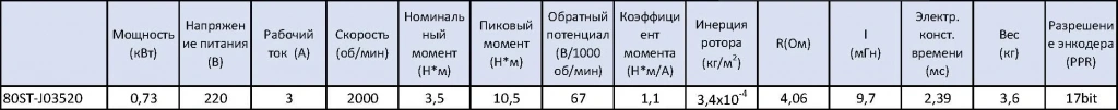 - STEP/DIR (синонимы STEP/SIGN, PULSE/DIR, PULSE/SIGN) - управление по 2 сигналам, логический 0/1 направление и меандр тактирования. Два оптоизолированных входа с сопротивлением 270 Ом для использования 5 В логики, при использовании напряжения выше 5В(12/24) в комплекте поставляется резистор на 2 кОм.Сервокомплект поставляется с PMSM приводом 80ST-J03520 в базовом оснащении с абсолютным энкодером TAMAGAWA 17 bit, все параметры сервопривода приведены в таблице ниже.