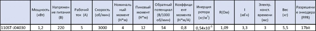 - STEP/DIR (синонимы STEP/SIGN, PULSE/DIR, PULSE/SIGN) - управление по 2 сигналам, логический 0/1 направление и меандр тактирования. Два оптоизолированных входа с сопротивлением 270 Ом для использования 5 В логики, при использовании напряжения выше 5В(12/24) в комплекте поставляется резистор на 2 кОм.Комплект поставляется с приводом 110ST-J04030 в базовом оснащении с абсолютным энкодером TAMAGAWA 17 bit, все характеристики привода приведены в таблице ниже.