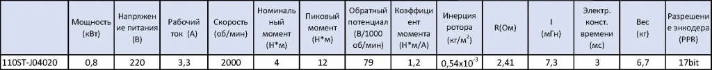 - STEP/DIR (синонимы STEP/SIGN, PULSE/DIR, PULSE/SIGN) - управление по 2 сигналам, логический 0/1 направление и меандр тактирования. Два оптоизолированных входа с сопротивлением 270 Ом для использования 5 В логики, при использовании напряжения выше 5В(12/24) в комплекте поставляется резистор на 2 кОм.Комплект поставляется с сервомотором 110ST-J04020 в базовом оснащении с абсолютным энкодером TAMAGAWA 17 bit, все параметры серводвигателя приведены в таблице ниже.