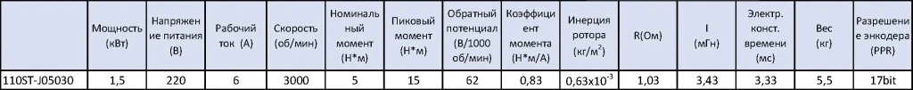 - STEP/DIR (синонимы STEP/SIGN, PULSE/DIR, PULSE/SIGN) - управление по 2 сигналам, логический 0/1 направление и меандр тактирования. Два оптоизолированных входа с сопротивлением 270 Ом для использования 5 В логики, при использовании напряжения выше 5В(12/24) в комплекте поставляется резистор на 2 кОм.Комплект поставляется с приводом 110ST-J05030 в базовом оснащении с абсолютным энкодером TAMAGAWA 17 bit, все характеристики сервопривода приведены в таблице ниже.