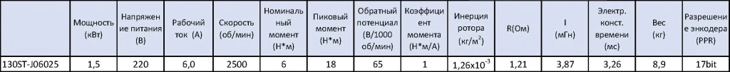 - STEP/DIR (синонимы STEP/SIGN, PULSE/DIR, PULSE/SIGN) - управление по 2 сигналам, логический 0/1 направление и меандр тактирования. Два оптоизолированных входа с сопротивлением 270 Ом для использования 5 В логики, при использовании напряжения выше 5В(12/24) в комплекте поставляется резистор на 2 кОм.Сервокомплект поставляется с PMSM приводом 130ST-J06025 в базовом оснащении с абсолютным энкодером TAMAGAWA 17 bit, все характеристики сервопривода приведены в таблице ниже.