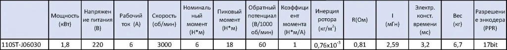 - STEP/DIR (синонимы STEP/SIGN, PULSE/DIR, PULSE/SIGN) - управление по 2 сигналам, логический 0/1 направление и меандр тактирования. Два оптоизолированных входа с сопротивлением 270 Ом для использования 5 В логики, при использовании напряжения выше 5В(12/24) в комплекте поставляется резистор на 2 кОм.Сервокомплект поставляется с сервоприводом 110ST-J06030 в базовом оснащении с абсолютным энкодером TAMAGAWA 17 bit, все характеристики сервопривода приведены в таблице ниже.