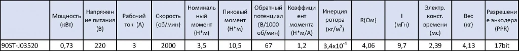 - STEP/DIR (синонимы STEP/SIGN, PULSE/DIR, PULSE/SIGN) - управление по 2 сигналам, логический 0/1 направление и меандр тактирования. Два оптоизолированных входа с сопротивлением 270 Ом для использования 5 В логики, при использовании напряжения выше 5В(12/24) в комплекте поставляется резистор на 2 кОм.Комплект поставляется с сервомотором 90ST-J03520 в базовом оснащении с абсолютным энкодером TAMAGAWA 17 bit, все параметры привода приведены в таблице ниже.