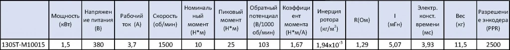 - STEP/DIR (синонимы STEP/SIGN, PULSE/DIR, PULSE/SIGN) - управление по 2 сигналам, логический 0/1 направление и меандр тактирования. Два оптоизолированных входа с сопротивлением 270 Ом для использования 5 В логики, при использовании напряжения выше 5В(12/24) в комплекте поставляется резистор на 2 кОм.Комплект поставляется с PMSM приводом 130ST-M10015 в базовом оснащении с инкрементным энкодером TAMAGAWA на 2500 строк, все характеристики привода приведены в таблице ниже.