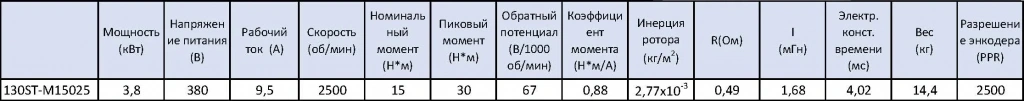 - STEP/DIR (синонимы STEP/SIGN, PULSE/DIR, PULSE/SIGN) - управление по 2 сигналам, логический 0/1 направление и меандр тактирования. Два оптоизолированных входа с сопротивлением 270 Ом для использования 5 В логики, при использовании напряжения выше 5В(12/24) в комплекте поставляется резистор на 2 кОм.Комплект поставляется с сервоприводом 130ST-M15025 в базовом оснащении с инкрементным энкодером TAMAGAWA на 2500 строк, все характеристики сервопривода приведены в таблице ниже.