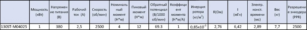 - STEP/DIR (синонимы STEP/SIGN, PULSE/DIR, PULSE/SIGN) - управление по 2 сигналам, логический 0/1 направление и меандр тактирования. Два оптоизолированных входа с сопротивлением 270 Ом для использования 5 В логики, при использовании напряжения выше 5В(12/24) в комплекте поставляется резистор на 2 кОм.Комплект поставляется с PMSM приводом 130ST-M04025 в базовом оснащении с инкрементным энкодером TAMAGAWA на 2500 строк, все параметры серводвигателя приведены в таблице ниже.