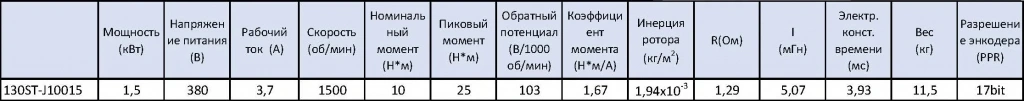 - STEP/DIR (синонимы STEP/SIGN, PULSE/DIR, PULSE/SIGN) - управление по 2 сигналам, логический 0/1 направление и меандр тактирования. Два оптоизолированных входа с сопротивлением 270 Ом для использования 5 В логики, при использовании напряжения выше 5В(12/24) в комплекте поставляется резистор на 2 кОм.Комплект поставляется с сервоприводом 130ST-J10015 в базовом оснащении с абсолютным энкодером TAMAGAWA 17 bit, все характеристики привода приведены в таблице ниже.