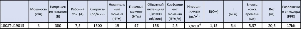 - STEP/DIR (синонимы STEP/SIGN, PULSE/DIR, PULSE/SIGN) - управление по 2 сигналам, логический 0/1 направление и меандр тактирования. Два оптоизолированных входа с сопротивлением 270 Ом для использования 5 В логики, при использовании напряжения выше 5В(12/24) в комплекте поставляется резистор на 2 кОм.Сервокомплект поставляется с сервомотором 180ST-J19015 в базовом оснащении с абсолютным энкодером TAMAGAWA 17 bit, все параметры серводвигателя приведены в таблице ниже.