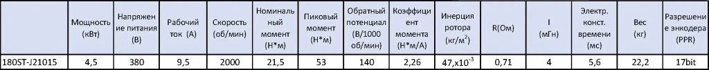 - STEP/DIR (синонимы STEP/SIGN, PULSE/DIR, PULSE/SIGN) - управление по 2 сигналам, логический 0/1 направление и меандр тактирования. Два оптоизолированных входа с сопротивлением 270 Ом для использования 5 В логики, при использовании напряжения выше 5В(12/24) в комплекте поставляется резистор на 2 кОм.Комплект поставляется с сервоприводом 180ST-J21015 в базовом оснащении с абсолютным энкодером TAMAGAWA 17 bit, все характеристики сервопривода приведены в таблице ниже.