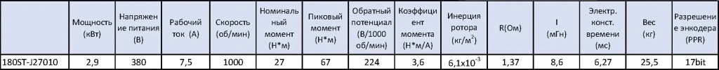 - STEP/DIR (синонимы STEP/SIGN, PULSE/DIR, PULSE/SIGN) - управление по 2 сигналам, логический 0/1 направление и меандр тактирования. Два оптоизолированных входа с сопротивлением 270 Ом для использования 5 В логики, при использовании напряжения выше 5В(12/24) в комплекте поставляется резистор на 2 кОм.Комплект поставляется с PMSM приводом 180ST-J27010 в базовом оснащении с абсолютным энкодером TAMAGAWA 17 bit, все характеристики привода приведены в таблице ниже.