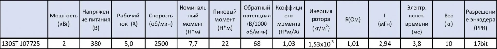 - STEP/DIR (синонимы STEP/SIGN, PULSE/DIR, PULSE/SIGN) - управление по 2 сигналам, логический 0/1 направление и меандр тактирования. Два оптоизолированных входа с сопротивлением 270 Ом для использования 5 В логики, при использовании напряжения выше 5В(12/24) в комплекте поставляется резистор на 2 кОм.Комплект поставляется с приводом 130ST-J07725 в базовом оснащении с абсолютным энкодером TAMAGAWA 17 bit, все параметры привода приведены в таблице ниже.