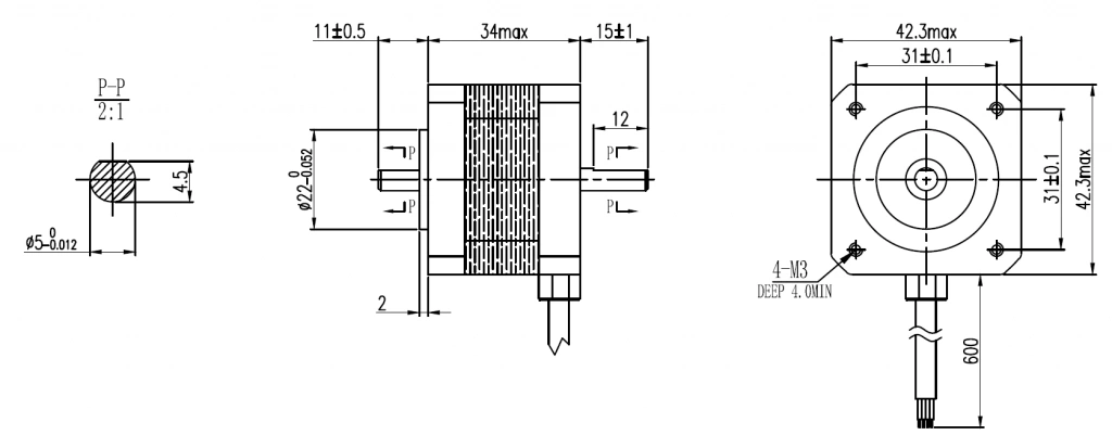 Шаговый двигатель с фланцем 42 мм (NEMA17), длиной корпуса 34 мм и двойным валом, имеет защищенный кабельный ввод, момент удержания 0,27 Н*м, корпус - пластинчатая кремниевая сталь, фланцы - дюраль, высококачественные подшипники DAHL/C&U обеспечивают минимальную вероятность проявления резонанса с их собственной частотой.