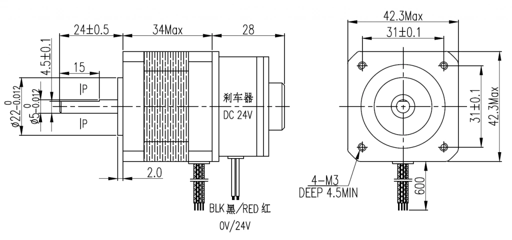 Шаговый двигатель с фланцем 42 мм (NEMA17), длиной корпуса 34 мм и тормозом 24В, имеет защищенный кабельный ввод, момент удержания 0,27 Н*м, корпус - пластинчатая кремниевая сталь, фланцы - дюраль, высококачественные подшипники DAHL/C&U обеспечивают минимальную вероятность проявления резонанса с их собственной частотой.