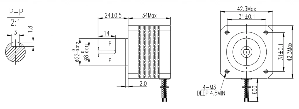 Шаговый двигатель с фланцем 42 мм (NEMA17), длиной корпуса 34 мм, вал 8 мм с шпонпазом, имеет защищенный кабельный ввод, момент удержания 0,25 Н*м, корпус - пластинчатая кремниевая сталь, фланцы - дюраль, высококачественные подшипники DAHL/C&U обеспечивают минимальную вероятность проявления резонанса с их собственной частотой.