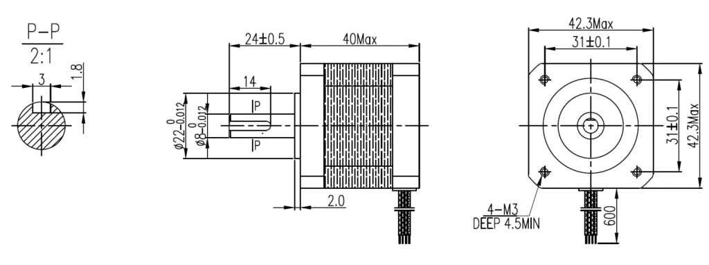 Шаговый двигатель с фланцем 42 мм (NEMA17), длиной корпуса 40 мм и валом 8 мм с шпонпазом, имеет защищенный кабельный ввод, момент удержания 0,40 Н*м, корпус - пластинчатая кремниевая сталь, фланцы - дюраль, высококачественные подшипники DAHL/C&U обеспечивают минимальную вероятность проявления резонанса с их собственной частотой.