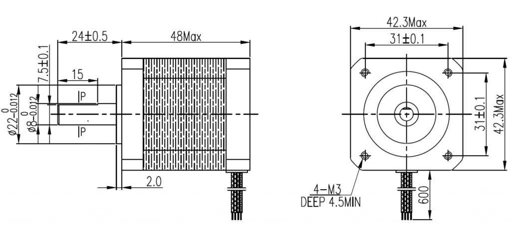 Шаговый двигатель с фланцем 42 мм (NEMA17), длиной корпуса 48 мм и валом 8 мм, имеет защищенный кабельный ввод, момент удержания 0,48 Н*м, корпус - пластинчатая кремниевая сталь, фланцы - дюраль, высококачественные подшипники DAHL/C&U обеспечивают минимальную вероятность проявления резонанса с их собственной частотой.