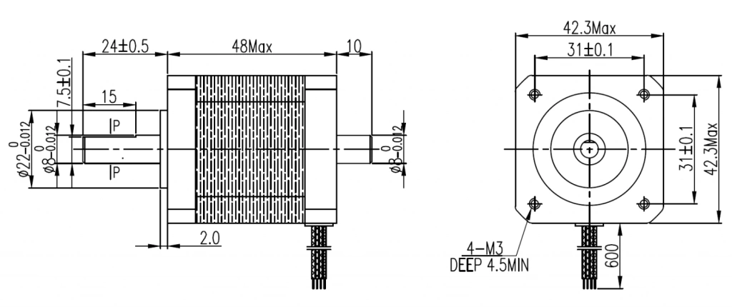 Шаговый двигатель с фланцем 42 мм (NEMA17), длиной корпуса 48 мм с двойным валом 8 мм, имеет защищенный кабельный ввод, момент удержания 0,48 Н*м, корпус - пластинчатая кремниевая сталь, фланцы - дюраль, высококачественные подшипники DAHL/C&U обеспечивают минимальную вероятность проявления резонанса с их собственной частотой.