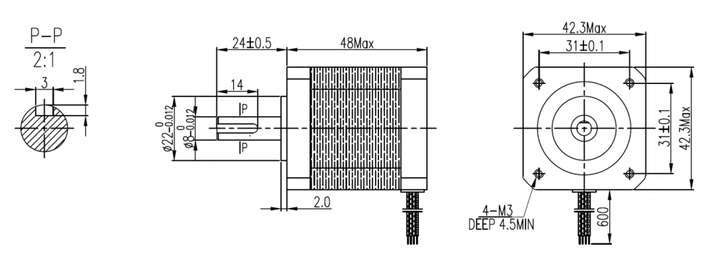 Шаговый двигатель с фланцем 42 мм (NEMA17), длиной корпуса 48 мм и валом 8 мм с шпонпазом, имеет защищенный кабельный ввод, момент удержания 0,48 Н*м, корпус - пластинчатая кремниевая сталь, фланцы - дюраль, высококачественные подшипники DAHL/C&U обеспечивают минимальную вероятность проявления резонанса с их собственной частотой.