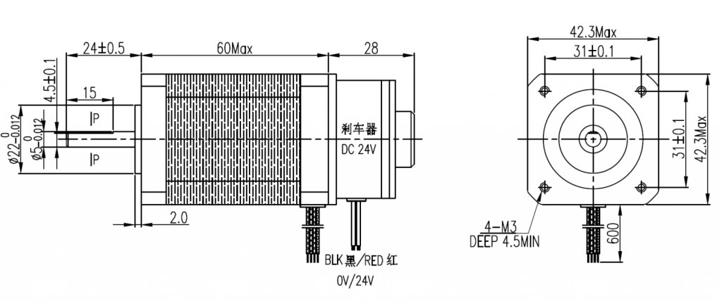 Шаговый двигатель с фланцем 42 мм (NEMA17), длиной корпуса 60 мм с тормозом, имеет защищенный кабельный ввод, момент удержания 0,85 Н*м, корпус - пластинчатая кремниевая сталь, фланцы - дюраль, высококачественные подшипники DAHL/C&U обеспечивают минимальную вероятность проявления резонанса с их собственной частотой.