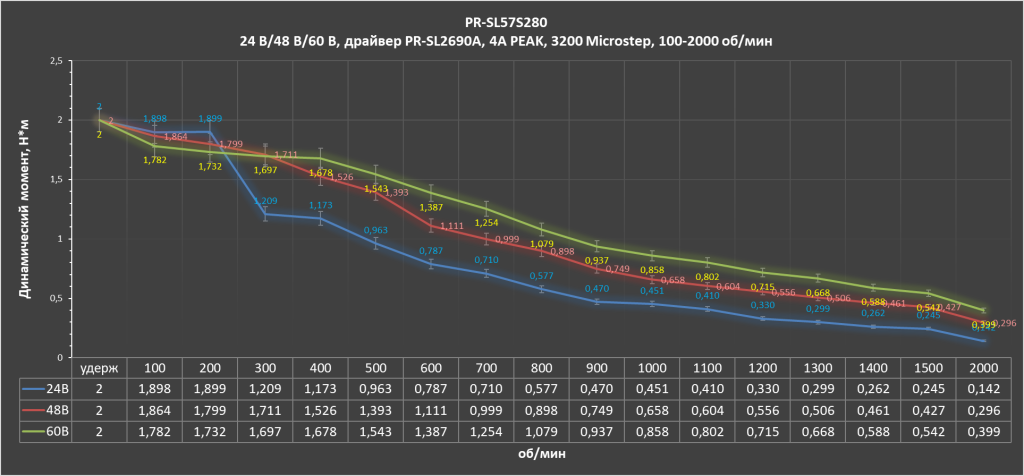 График изменения динамического момента шагового двигателя PR-SL57S280-BRK, от 0 до 2000 об/мин, 24 В/48 В/60 В