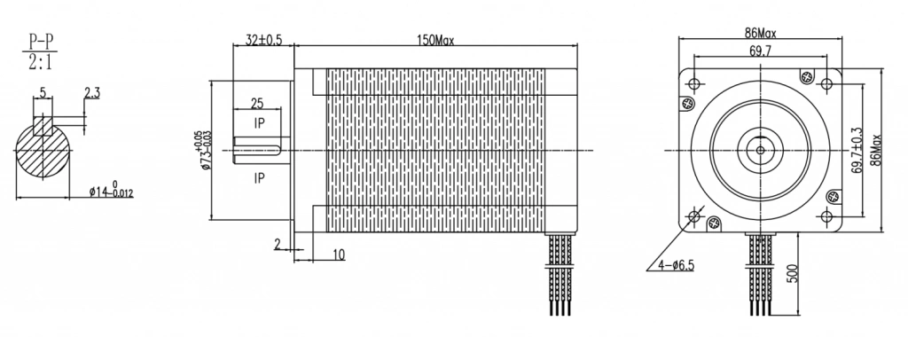 Шаговый двигатель с фланцем 86 мм (NEMA34), длиной корпуса 150 мм, имеет защищенный кабельный ввод, момент удержания 12,7 Н*м, корпус - пластинчатая кремниевая сталь, фланцы - дюраль, высококачественные подшипники DAHL/C&U обеспечивают минимальную вероятность проявления резонанса с их собственной частотой.
