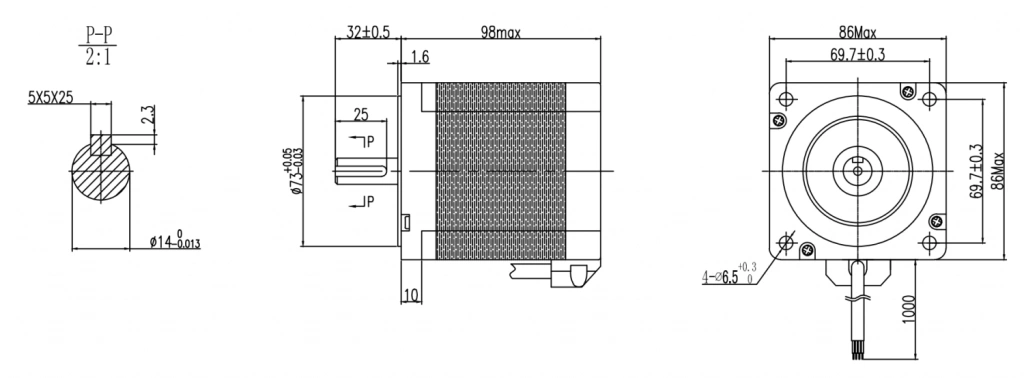 Шаговый двигатель с фланцем 86 мм (NEMA34), длиной корпуса 98 мм, имеет защищенный кабельный ввод, момент удержания 6,5 Н*м, корпус - пластинчатая кремниевая сталь, фланцы - дюраль, высококачественные подшипники DAHL/C&U обеспечивают минимальную вероятность проявления резонанса с их собственной частотой.