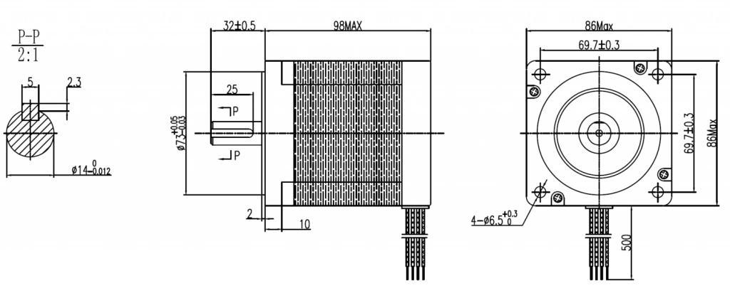 Шаговый двигатель с фланцем 86 мм (NEMA34), длиной корпуса 98 мм, имеет защищенный кабельный ввод, момент удержания 6,0 Н*м, корпус - пластинчатая кремниевая сталь, фланцы - дюраль, высококачественные подшипники DAHL/C&U обеспечивают минимальную вероятность проявления резонанса с их собственной частотой.